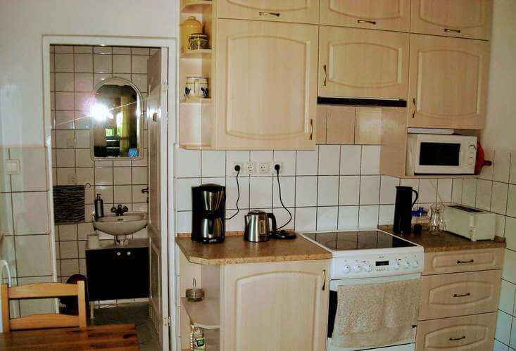 Kuchnia jest w pełni wyposażona: lodówka, kuchenka elektryczna z piekarnikiem, zmywarka, kuchenka mikrofalowa, ekspres do kawy, czajnik, toster, zestaw garnków i naczyń. Stoi w niej stół, przy którym usiądą 4 osoby.